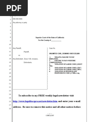 Sample California Complaint For Unpaid Wages Failure To Pay Overtime Or Provide Meal Or Rest Breaks Overtime Employment